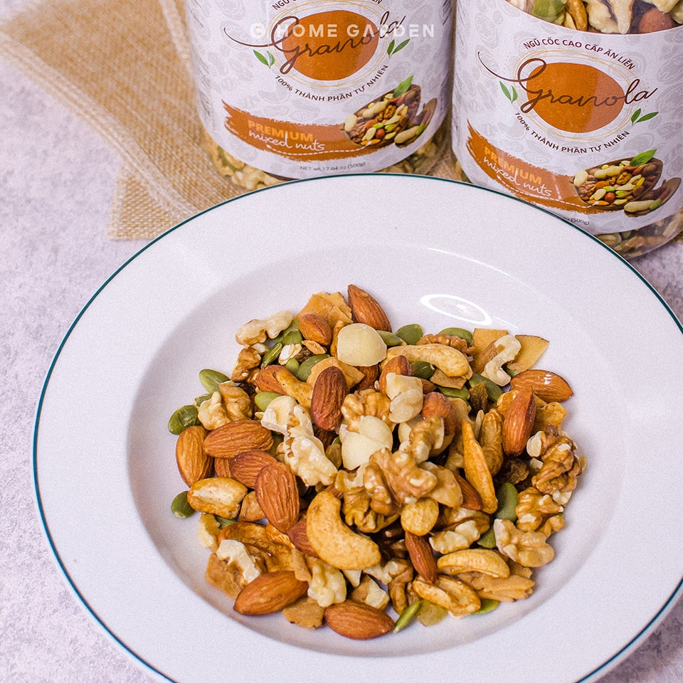 - Thành phần siêu vip: Macca, nhân quả óc chó, hạnh nhân, hạt điều, mật ong ĐakLak, yến mạch Úc, mơ vàng, nho khô, bí xanh, dừa khô…